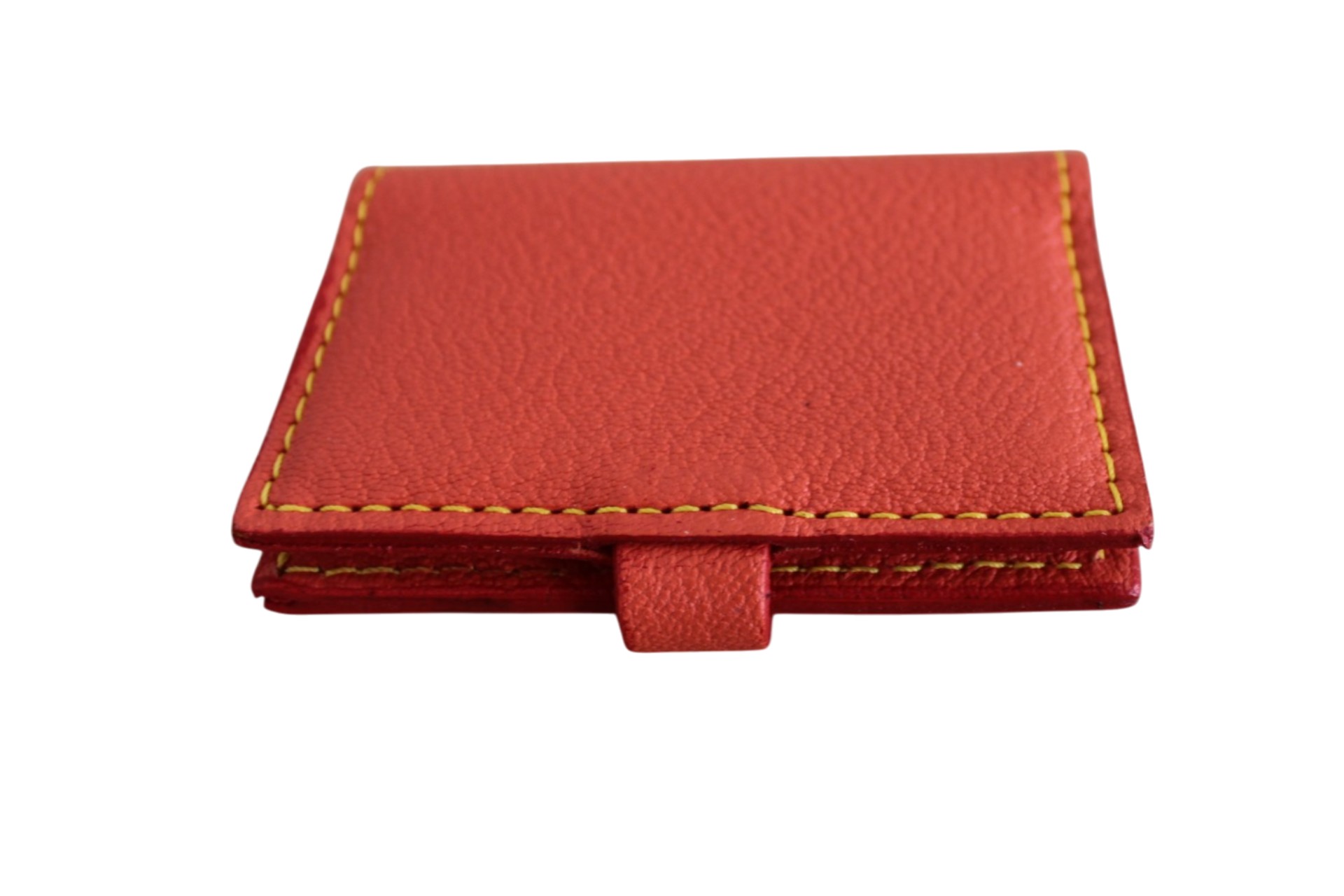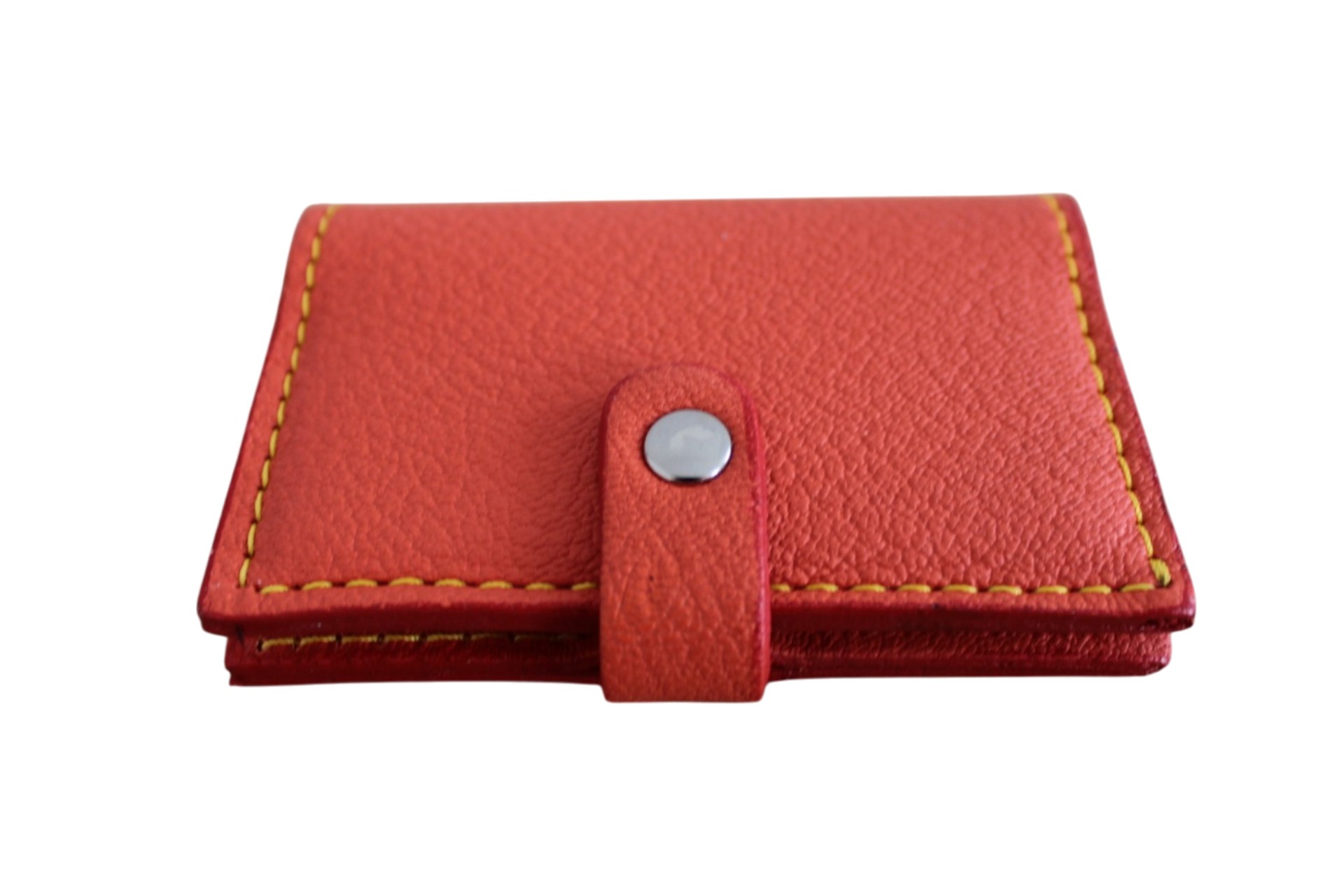 Ce porte-cartes en cuir se distingue par son extérieur rouge profond rehaussé de coutures contrastées et son intérieur jaune lumineux, signature d’un style à la fois élégant et audacieux. Sa languette avec bouton pression assure une fermeture sécurisée tout en apportant une touche distinctive.